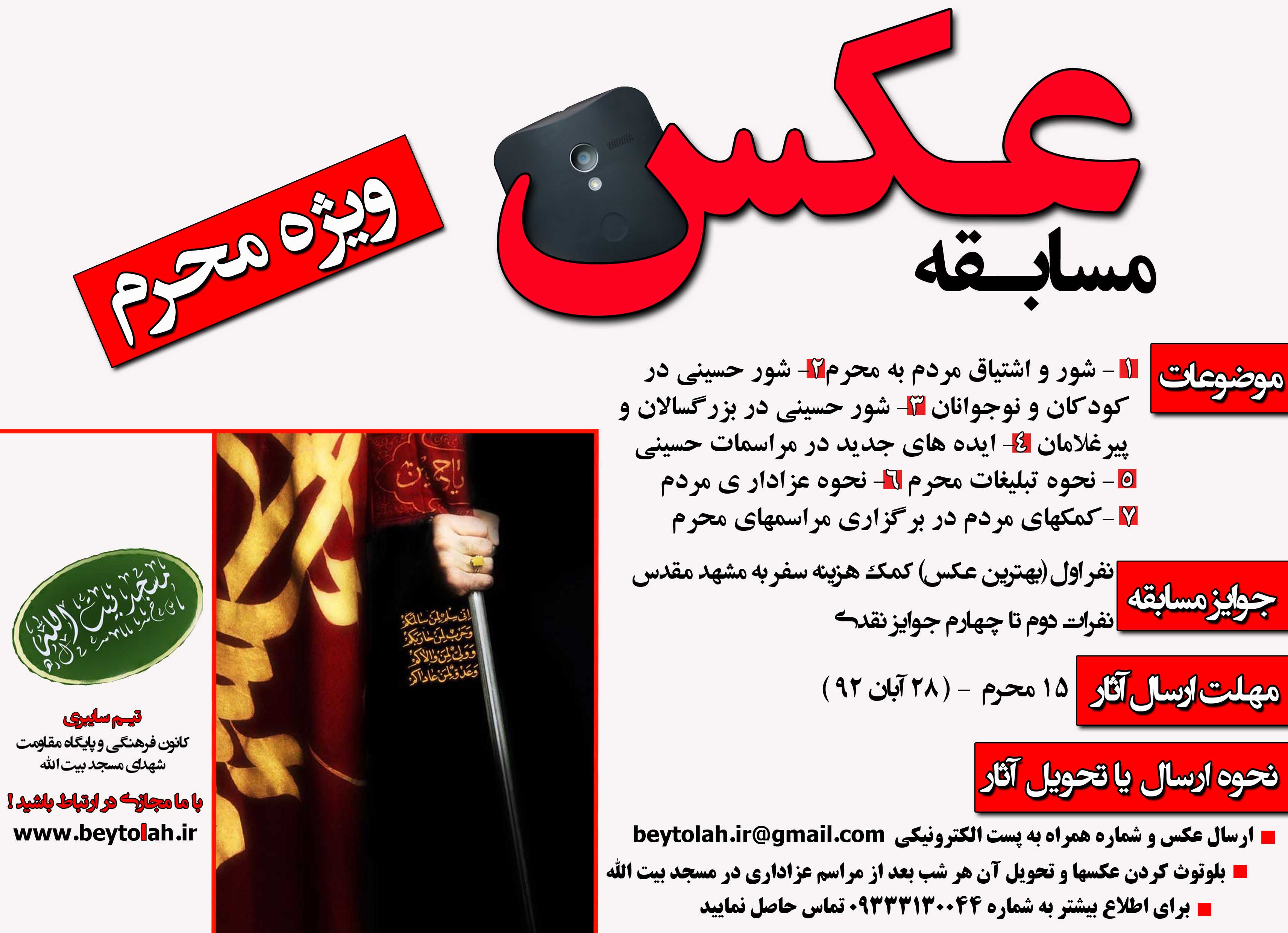 تصاویر رو به آدرس Beytolah.ir@Gmail.ir ایمیل کنید یا بعد از مراسم عزاداری مسجد بیت الله ، برای ما بلوتوث نمایید و تا 15 محرم فرصت دارید